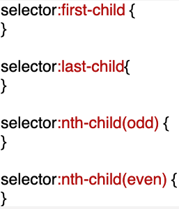 CSS selector를 표기하는 방법중에 해당 태그의 첫 번째 순서인지, 마지막 순서인지, 홀수/짝수 인지 알 수 있는 selector 표기법이 있다.