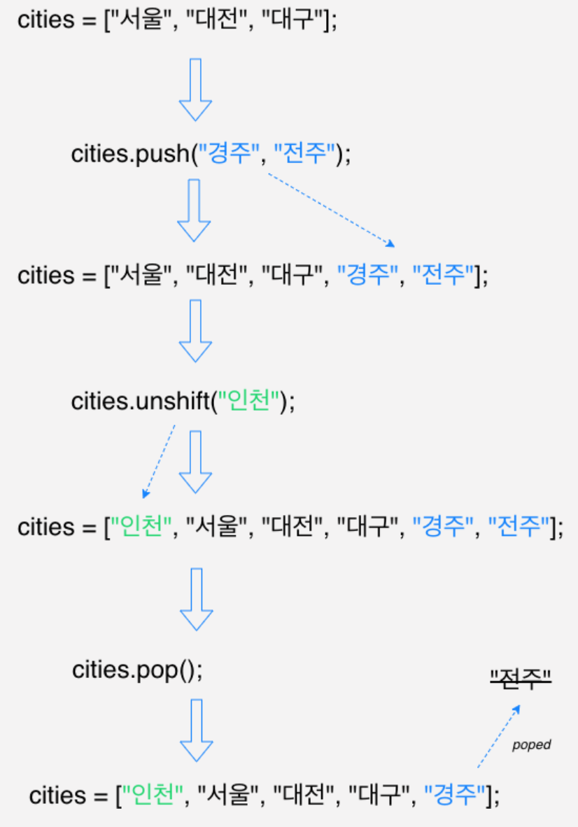 push는 array의 마지막 부분, 즉 꼬리에 요소들을 추가하고 unshift는 array의 맨 앞부분, 즉 머리 부분에 요소를 추가해준다.
