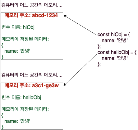 그래서 눈에 보이는 데이터는 똑같지만, hiObj와 helloObj가 갖고 있는 진짜 값은 다른 것이다.