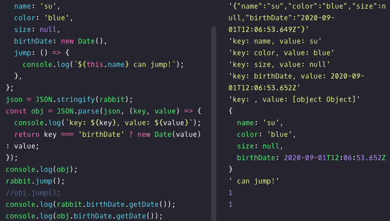 parse는 reviver이라는 콜백 함수를 전달할 수 있다. key와 value의 파라미터를 받아서 콘솔에 확인해보면 모든 key와 value가 출력되는 것을 알 수 있다. 여기서 세밀한 데이트로 변환하고 싶을 시에는 return값에 삼항 연산자를 이용해서 key가 birthDate라면 새로운 Date Object를 만들 것이고, 그렇지 않다면 원래 설정한 value를 쓴다고 설정하고 key를 birthDate로 하면 birthDate의 value가 다르게 출력되는 것을 볼 수 있다. 여기서 새로운 Date Object를 만들었으니 기존 obj.birthDate에서 + .getDate()를 입력해주면 날짜가 출력되는 것을 알 수 있다.