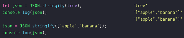 배열을 JSON으로 변환시 콘솔엔 배열 타입으로 보이면서 더블 쿼트("")로 찍힌 결과를 볼 수 있다. 이것이 JSON의 규격사항이다.