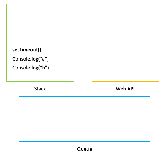 콘솔 a가 setTimeout에 있다 생각하고 예를 들어보면, 일단 스택에 다 들어가게 된다. 자바스크립트는 이것을 보고 타임아웃 부분을 Web API로 가져간다.(Web API는 브라우저가 관리) 그리고 나선 콘솔 b를 실행시키고 스택이 끝나게 된다.