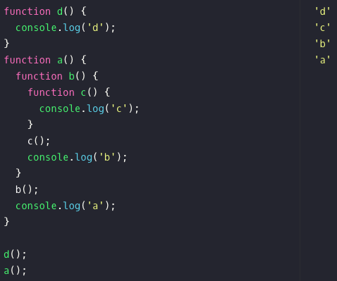 (함수 d 실행 👉🏻 콘솔 로그 d 실행 👉🏻 콘솔로그 d 호출 스택에서 제거 👉🏻 더 이상 실행할 게 없는 함수 d 제거 👉🏻 호출 스택 내부가 아무것도 없는 상태에서 함수 a 실행 👉🏻 함수 a안에 함수 b 실행 👉🏻 함수 b안에 함수 c 실행 👉🏻 콘솔 로그 c 실행 👉🏻 콘솔로그 c 호출 스택에서 제거 👉🏻 함수 c 제거 👉🏻 콘솔로그 b 실행 👉🏻 콘솔로그 b 호출 스택에서 제거 👉🏻 함수 b 제거 👉🏻 콘솔로그 a 실행 👉🏻 콘솔로그 a 호출 스택에서 제거 👉🏻 함수 a 제거)