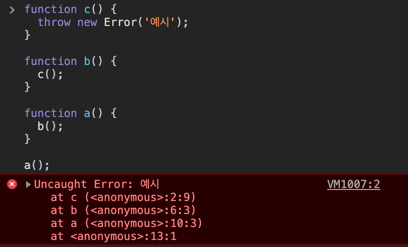 그리고 브라우저 콘솔에서 에러 스택들을 표시해 줄 때에도 콜 스택의 현재 상태를 나타내는 것이다. 실패한 함수를 나타낼 때에는 스택처럼 top부터 bottom까지 나타낸다.(아래 예시)