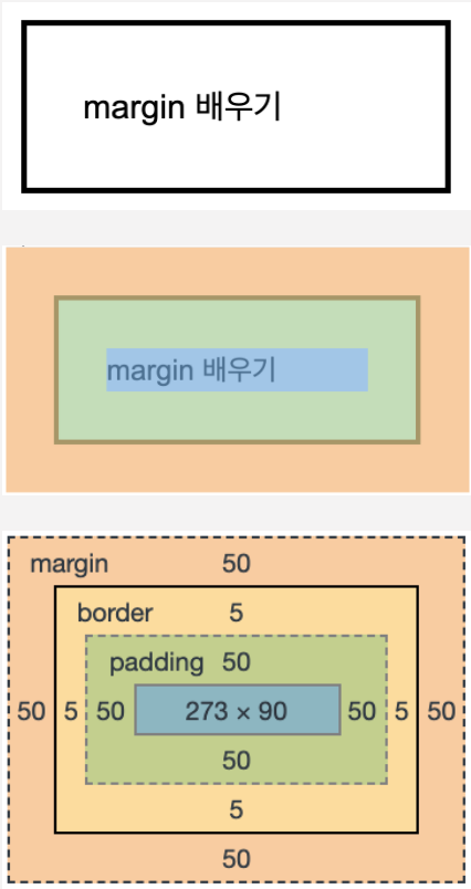 그림에서 273px이라는 가로값은 padding 영역이 합쳐진 가로길이이다. 그리고 margin은 border 외부에 생기는 여백이다. 두 번째 사진처럼 margin(주황색)까지 합쳐진 가로길이는 총 373px이다. → 273 + 50(왼쪽margin) + 50(오른쪽 margin) = 373px