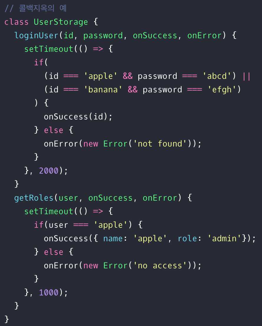 콜백 함수 안에서 다른 함수를 호출하고 그 안에서 또 다른 콜백을 전달하고 그 안에서 다른 것을 호출하고 계속 반복하게 되는 것이 콜백 지옥이라 한다.